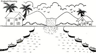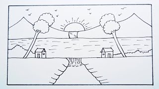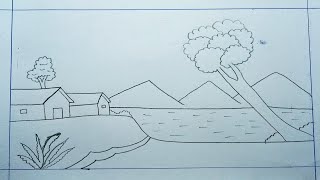Beautiful House Drawing With Pencil | Ghar ka Chitra | House Drawing | River Scenery Drawing | Sun 🌞
