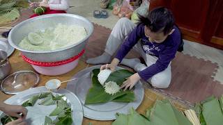 A close-up view of hands with 60 years of experience wrapping banh chung (Vietnamese rice cakes) ...