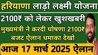 हरियाणा लाड़ो लक्ष्मी योजना बड़ी खुशखबरी। मुख्यमंत्री ने करदी घोषणा 2100 ₹ बजट ऐलान। 17 मार्च धमाका।