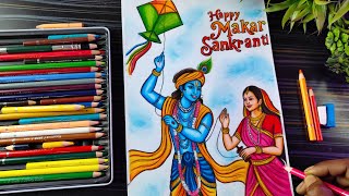 Happy Makar Sankranti Drawing🪁,How To Draw Makar Sankranti with Radha Krishna, Kite Festival Drawing
