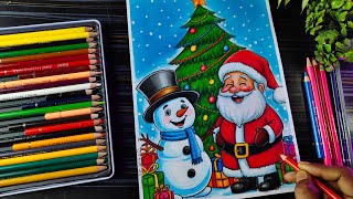 Merry Christmas Drawing, Santa Claus Drawing, How To Draw Santa With Snowman, Christmas Tree Drawing