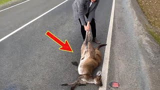 A hungry and thirsty deer lost its mother and recklessly stopped a car to ask for help.
