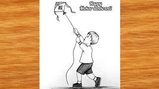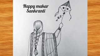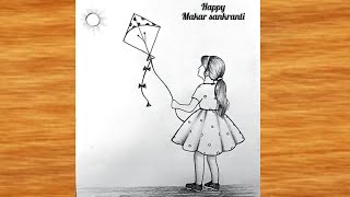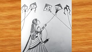 Makar sankranti Drawing very easy || Pencil Drawing easy || A Girl flying kite Drawing || Pencil art