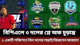 বিপিএলে ৩ দলের প্লে অফ চূড়ান্ত। বাকি ১ একটি পজিশনে তিন দলের লড়াই। ফিরছেন ফারহান! BPL Playoff 2026|