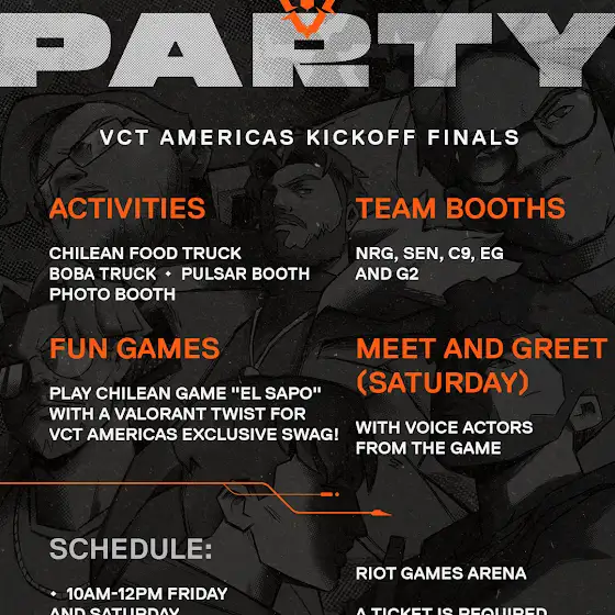 🥳 BLOCK PARTY WEEKEND 🥳We're closing out #VCTAmericas Kickoff with a party to remember 👀Meet the VA's for KAY/O, Jett, and Raze, try some delicious Chilean dishes, and more!