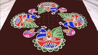 Peacock Rangoli with 15X8 dots | Cute deepam rangoli | Mayil kolam | how to create peacock rangoli
