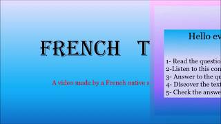 This channel was made by a French native speaker to help you to learn French: vocabulary, pronunciation, grammar, dialogues, sayings, common phrases, conjugation, listening comprehension, reading comprehension… It's a funny way to learn :)