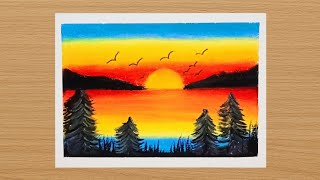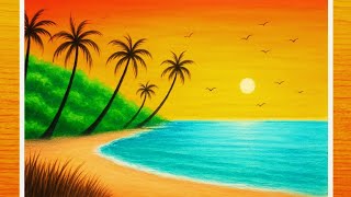 Oil Pastel Drawing | Easy Sunset Landscape Tropical Beach Drawing Step by Step Tutorial for Beginner