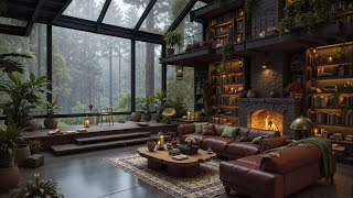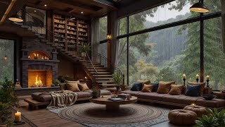 Cozy Living Room on Rainy Day Ambience - Smooth Jazz Piano Music & Relaxing Rain, Fireplace Sounds 🔥