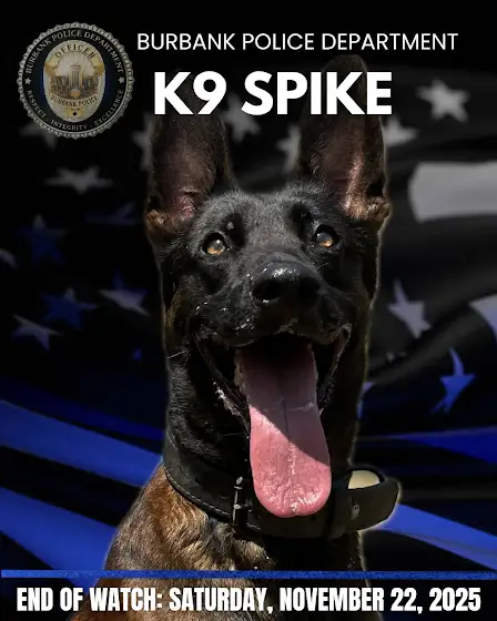 A heartbreaking scene unfolded in Burbank last night after a traffic stop on Buena Vista Street near the 5 Freeway. Police say a fleeing suspect shot and killed K-9 “Spike”, who had located him during the search. Spike was rushed to an emergency veterinarian but did not survive. He was described as an intelligent and devoted partner who had just celebrated a birthday.
